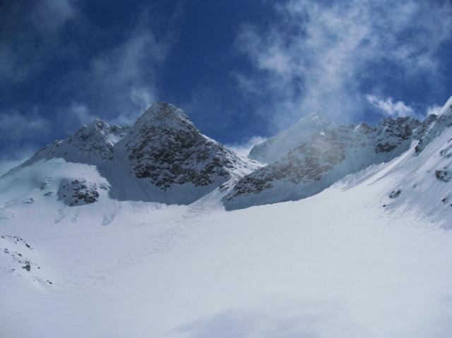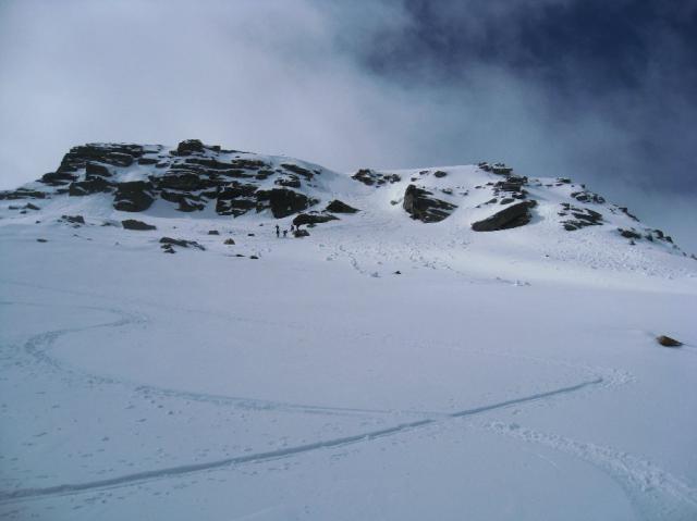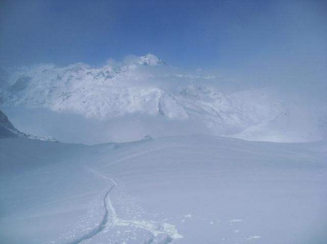 Heute, Ostermontag, erneuter Anlauf bei bestem Wetter. Aufgrund des Sturms heute große Treibschneeansammlungen und entsprechend mit großer Vorsicht gegangen. Nicht über die normale Route auf den Gipfel, sondern über eine kleine Rinne auf den Südostrücken und weiter zum Gipfel. Abfaht bei pefektem Firn.