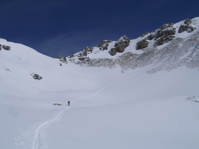 Tourenverhältnisse: nach den Neuschneefällen der Ostertage am 09.04. ein 'Hochwintertour', zwar bei Sonnenschein aber auch bei -9°, zum Gr. Silberpfennig (2600m). kompakter Pulver z.T. leicht windgepresst, Westseiten sind stellenweise abgeblasen, deutlicher Temperaturanstieg im Laufe des Nachmittags.