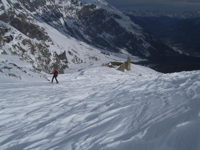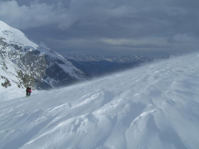 Am nächsten Tag zum Hocharn, schönes Wetter bei beginnendem Föhnwind, der im Lauf des Tages Sturmstärke erreichte. bei der Abfahrt kompakter Pulver z.T. windgepresst; ab ca. 2100hm weicher Frühjahrsschnee, ging super zu fahren; oberhalb von ca. 2300m Einwehungen beachten