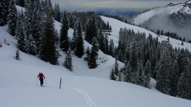 Tourenverhältnisse: Im Büro sitzend ein Blick auf die WebCam - Schneefall auf dem Spitzingsattel ! - und ab gings in den Feierabend. Aufstieg gegen 16 Uhr auf der Stümpflingabfahrt, leichter Schneefall. Ab Osthangalm dann Spurarbeit, gute 5 cm Neuschnee auf fester Unterlage. Kein Mensch weit und breit. Je später desto besser wurde das Wetter, trotz eisigem Wind tolle Stimmung am Gipfel. Abfahrt in unverspurtem Gelände - ein Traum! Auf dem Rückweg noch beim Italiener eingekehrt - besser gehts nicht !