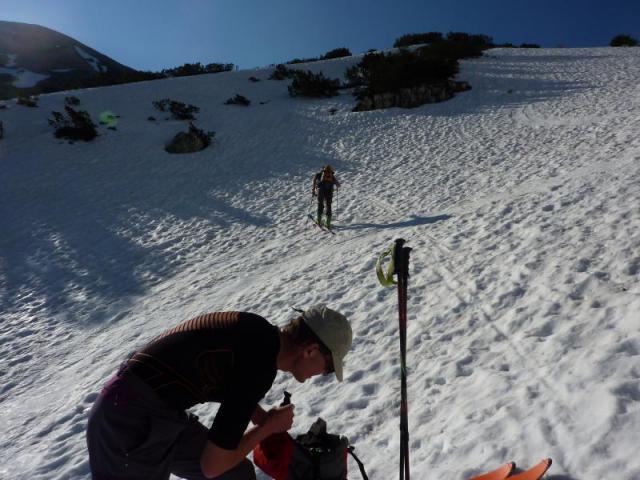 Tourenverhältnisse: Tour hier beschrieben http://www.tourentipp.de/de/to…arspitze-Skitour_792.html, mit Radl bis Wildfütterung, Ski getragen bis ca 1850m (oberhalb Steilstufe) dann bis auf die letzten Meter mit Ski. Abfahrt bis ca 1600m, bester Firn.