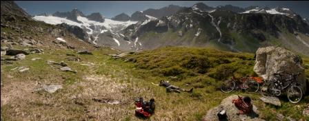 Fahrrad-Depot am Materiallift der Hütte, im Hintergrund (oben rechts) der Südgrat mit Reichenspitze und Gabler noch rechts daneben: