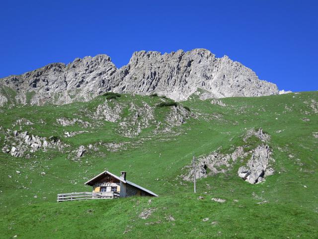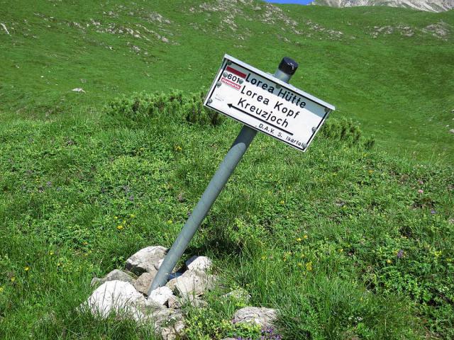 Im Aufstieg ist jetzt der Abkürzer, der die Loreahütte auslässt und direkt zur Loreaalm (Bild 2) führt, neu markiert worden (Bild 1: der Wegweiser "Kreuzjoch" zeigt an dieser Weggabelung allderdings nach links über die Loreahütte). So gibt's auch hier im nur schwer erkennbaren Pfad keine Orientierungsprobleme mehr. An der Loreaalm mündet der Steig in den Verbindungsweg Loreahütte - Kreuzjoch ein (hier muss man sich rechts halten).
