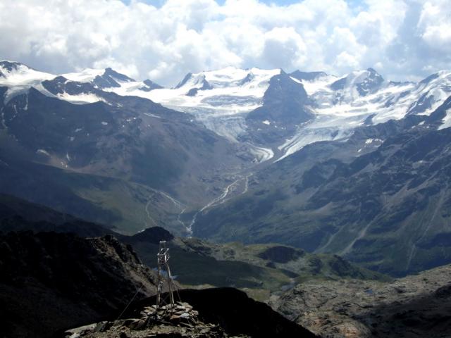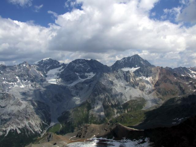Die Aussicht ist eine Sensation: das Suldener Dreigestirn sieht man ausnahmsweise mal "von hinten", was auch äussert eindrucksvoll ist, noch schöner ist aber den Blick nach S in den noch reich vergletscherten Forni-Kessel. So überlaufen der Vioz ist, so einsam ist der Confinale....
