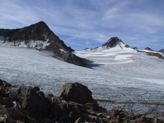 1. Tag: von Vent aus durchs Rofental zum Hochjoch-Hospiz (erfreulich "unlangweilig", da die Rofenache hier einen hübschen Canyon mit Wasserfällen ausbildet); den Nachmittag genussvoll auf dem aussichtsreichen Hüttenberg, der Mittleren Guslarspitze, vertrödelt (guter, völlig harmloser Weg bis zum Gipfel; seit einiger Zeit auch markiert und beschildert; trotzdem offenbar recht wenig besucht)