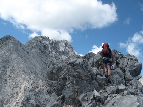 Am Mittwoch vom Kreuzeckhaus über Bernadeinsteig und Stuibenhütte zur Mauerscharte und über den Ostgrat auf den Hohen Gaif. Zwei zwingende Abseilstellen, eine weitere (dann als erste) sinnvoll. Ansonsten teilweise noch Wandergelände, teils schöne Kletterei bis II. Am eigentlichen Blassengrat ebenfalls schöne Kletterei in meist festem Fels. Wir kletterten zwei Seillängen gesichert, den Rest ohne Sicherung, dazu insgesamt vier Stellen, an denen wir abseilten, zuletzt 25m beim Übergang vom Vor- zum Hauptgipfel. Hinter der Blassenspitze ein Stück Querung in der Südflanke über Schuttbänder, die den Gesamteindruck der Tour leicht eintrüben. Dann aber wieder über feste Rippen weiter zum Vor- und Hauptgipfel. Am anspruchsvollsten empfanden wir aber einen Teil des Abstiegs über den Normalweg, da man dort ein Stück sehr steil über teilweise brüchigen Fels und vorallem sehr viel Schutt in eine Rinne hinabsteigen muss. Dort ist es so gut wie unmöglich, keinen Steinschlag zu verursachen. Wenn dann noch andere Bergsteiger unter einem direkt in Schusslinie ohne Helm absteigen... Der Abstieg durchs Grieskar zurück zum Bernadeinsteig und zum Kreuzeckhaus zieht sich dann nochmal sehr lang. Wir waren erst bei Einbruch der Dunkelheit nach insgesamt 15 Stunden (10 Stunden bis zum Hochblassen, 4,5 Stunden runter) wieder am Haus zurück und wussten noch ein paar Leute (vom Jubiläumsgrat kommend) weit hinter uns... Insgesamt sehr eindrucksvolle Tour.