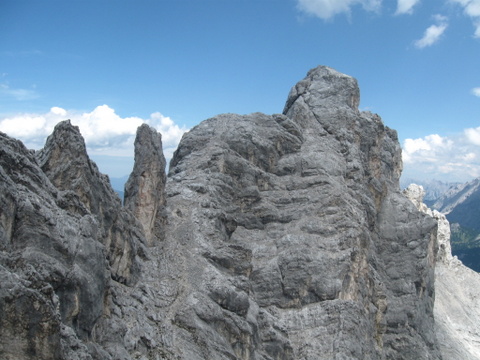 Bild 4: Turm im Anschluss an den Gaif-Westgrat, von dem aus man in die enge Scharte dahinter abseilt mit anschließendem Spreizschritt