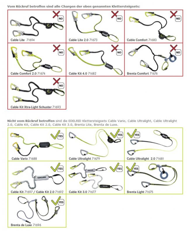 Betrofen sind EDELRID Klettersteigsets aus den Produktionsjahren 2010, 2011 und 2012 mit den Artikelnamen: