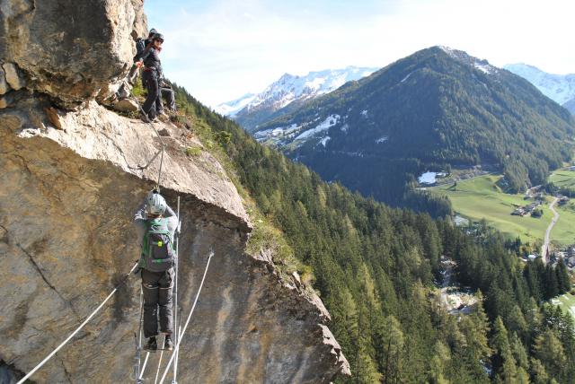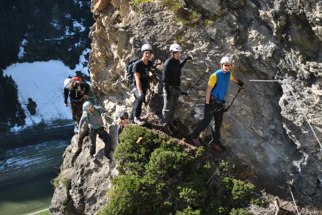 Während man im schattigen Dorf fast schon die Winterjacke braucht, genießt man oben in der Wand die pure Sonne und beste Klettersteigverhältnisse.