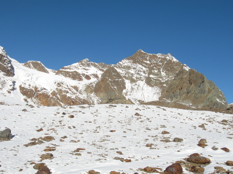 Am Sonntag Versuch, die Eiskastenspitze zu besteigen. Hierzu zunächst auf dem Fuldaer Höhenweg, dann auf den Offenbacher Höhenweg abzweigen und diesen wiederum auf ca. 2770m (wo der Höhenweg nach rechts ins benachbarte Kar abbiegt) in östlicher Richtung verlassen. Nun wohl auf Steigspuren über viel Schutt, der jetzt schon überwiegend verschneit war, rechts am Gletscher entlang und weiter rechts in die Karbucht abbiegen. Aufstieg bis zu großen Felsflanken, unter denen man auf ca. 3150m nach rechts in Richtung einer schwach ausgeprägten Rinne/Rampe quert und durch/über diese hoch. Der Steig ist immer wieder mit Steinmännern bestückt, ein Weg scheint das aber nicht zu sein. Bei uns lag ab ca. 2700m eine weitgehend geschlossene Schneedecke, in die man meist bis zum Wadl, teilweise aber auch tiefer einsank. Nassschnee. Abbruch an der besagten Rampe auf ca. 3200m wegen glatter, feuchter bzw. noch leicht verschneiter Platten. Bereits kurz unterhalb ein wenig Ier-Kletterei in steilem, verschneiten Fels. Statt Gipfel Schmoren im Schnee in der Oktobersonne. Eine Besteigung des Wurmtaler Kopfes über den Offenbacher Höhenweg wäre bei diesen an sich nicht schlechten Verhältnissen die erfolgversprechendere Tour gewesen.