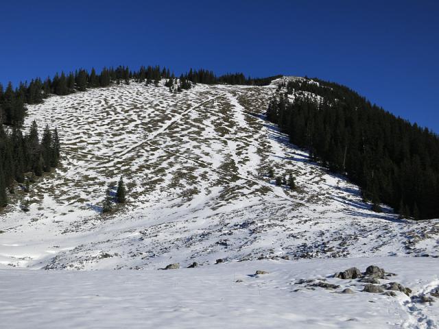 Tourenverhältnisse: Aufstieg auf schneefreiem Fahrweg zur Unteren Firstalm (Bild 1; derzeit Betriebsruhe). Dann weiter zur Oberen Firstalm (geöffnet) weitgehend ohne Batz auf Plattenweg. Von dort den Brecherspitzhang (Bild 2) hinauf: teils noch Schnee, teils erdiger Weg, teils feuchte Wiese. Auch der Grat bis zum Gipfel bietet keine Probleme (trocken bzw. Schneereste, kurze eisige Stellen hatten ein Drahtseil).