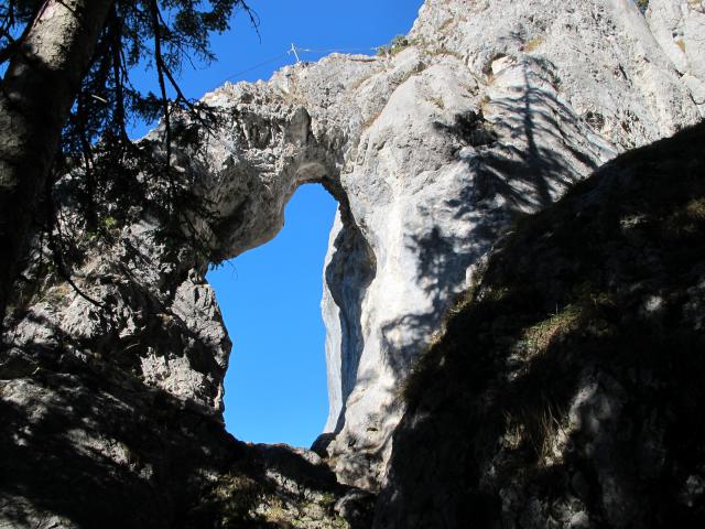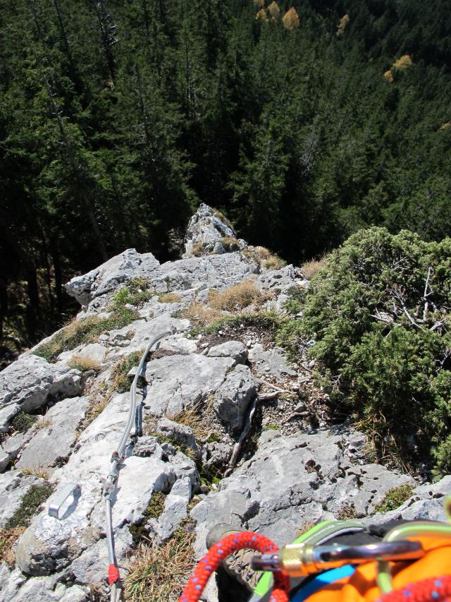 Die Route übers Fensterl ist teilweise steil, jedoch unschwierig, nur von der Orientierung ohne Ortskenntnis nicht unproblematisch. Wir hatten einige kleine Verhauer. Wenn man den Weg kennt, kein Problem, aber im Wald gibt es immer wieder Pfade, die von der eigentlichen Route abweichen, so dass schon ein Portion Orientierungssinn nötig ist. Wir werde in kürze eine Beschreibung mit GPS-Track veröffentlichen. Der Extra-Gipfel aufs Breitensteiner Fensterl ist optional. Die schwierigste Stelle (etwa III UIAA) ist ohne Sicherung gleich am Einstieg, danach teilweise Seilsicherung und Eisenbügel (eher B-Klettersteigstellen), allerdings würde ich den Sicherungen nicht 100%ig vertrauen.
