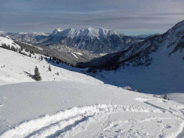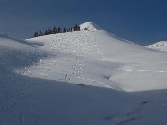 Tourenverhältnisse: Super Bedingungen von unten weg. Am Parkplatz ca. 30 cm Schnee (und -16°C), der nach oben immer mehr wird. Entlang der Forststraße zum Ombrometer und den normalen Weg zum Gipfel. Oben etwas windverblasen aber immer noch top. Abfahrt rechts des Baches und dann wieder zur Ombrometerwiese. Waldschneise auch gut fahrbar, den Rest dann auf der Forststraße zurück. Alles in allem ein super Saisonauftakt mit wenig Leuten. Die meisten sind Richtung Retherkopf gegangen.