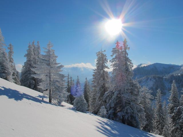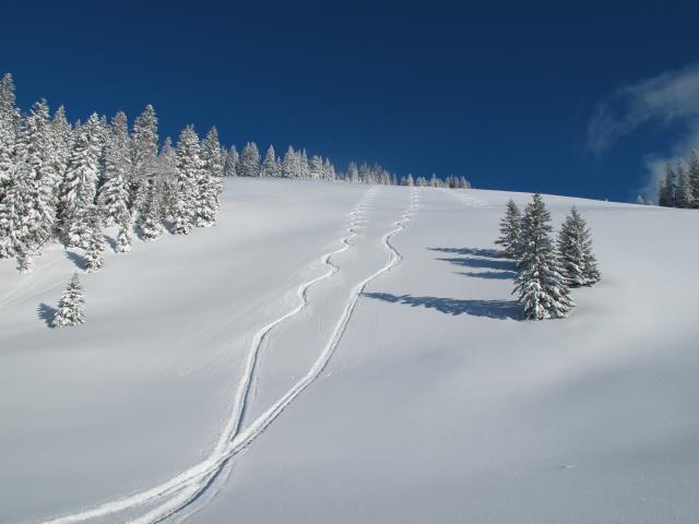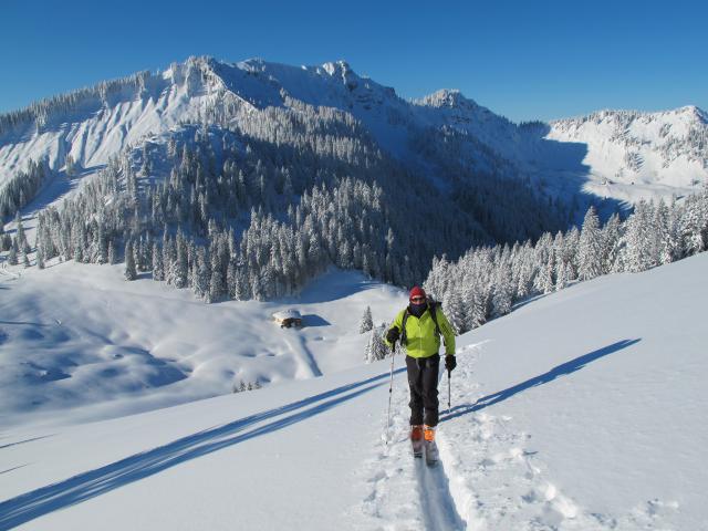 Tourenverhältnisse: Perfekt! Unten ca. 60 cm, oben bis 80 cm Schnee, auf der sonnseitigen route auch schon etwas gesetzt, so dass man auch in den mäßig steilen Passagen schon gut fahren konnte. In der rechten Hanghälfte (im Aufstiegssinn) fehlt durch Windeinfluss etwas die Unterlage, hält man sich jedoch bei der Abfahrt von oben weg gleich rechts (im Abfahrtssinn) hat man perfekten Powder. Unten haben wir sogar noch spuren dürfen, oben waren bereits 2 Skitourengeher vor uns, so dass wir die 3. und 4. Spur in den hang legen durften - ein Traum!