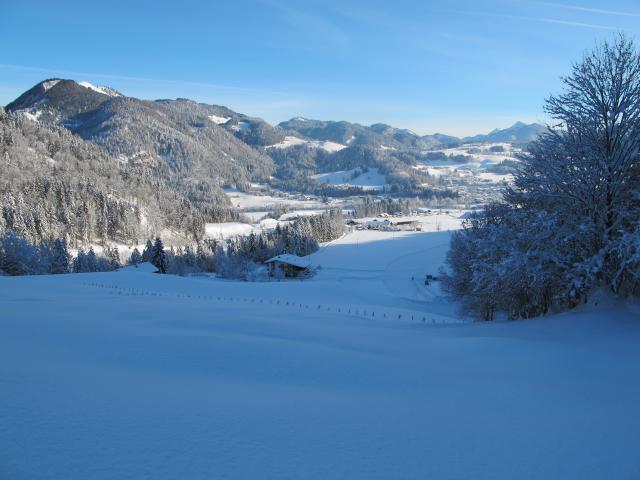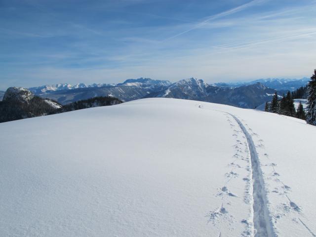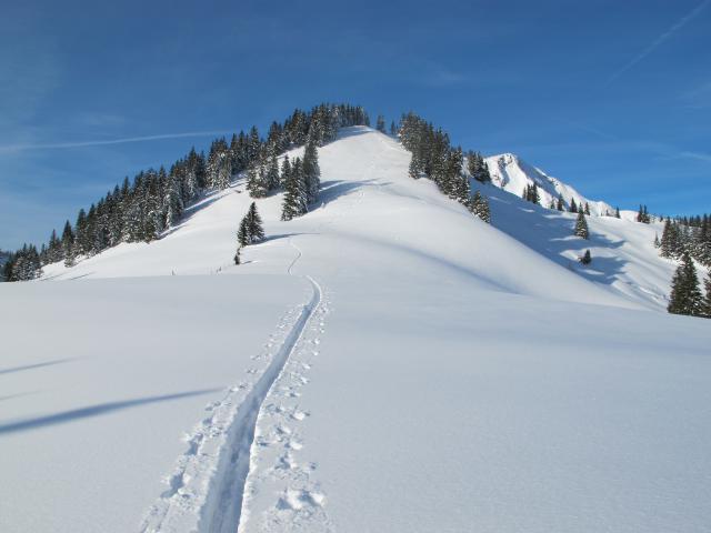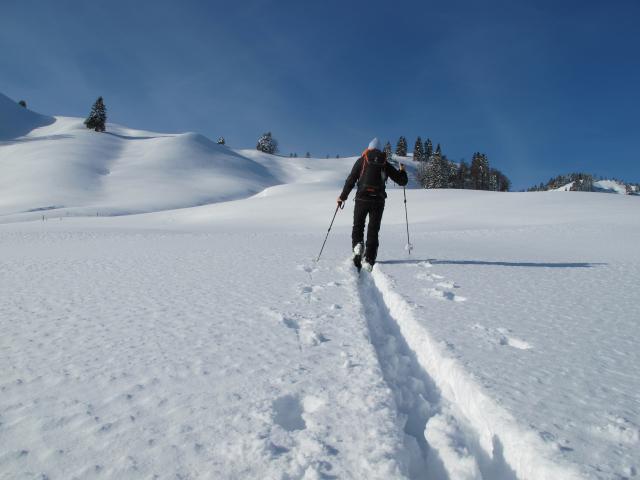 Tourenverhältnisse: Eiskalt am Morgen (-20 Grad). Ausreichend Schnee von unten weg. Einwehungen am südseitigen Hang bei der Unteren Nothegger Alm, hier bin ich auf dem Almweg geblieben und habe den relativ steilen Wiesenhang selbst nicht berührt. Schnee hat in der Sonne schon einen leichten Deckel bekommen, darunter noch nicht so gut gesetzte Schneedecke (anders als gestern an der Brecherspitze) und daher nicht so gut zu fahren. In den Flachpassagen zuviel Neuschnee zum Schwingen, Steilpassagen sind aber kritisch zu bewerten, die Lawinengefahr ist (meines Erachtens) nicht unerheblich. Vor mir war noch keiner am Gipfel - gespurt. Landschaftlich schöne Tour, jedoch viele Flachpassagen.