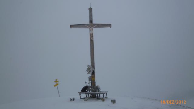 Oben starker Wind und auch Nebel, schlechte Sicht, Grat etwas vereist, aber fahrbar.