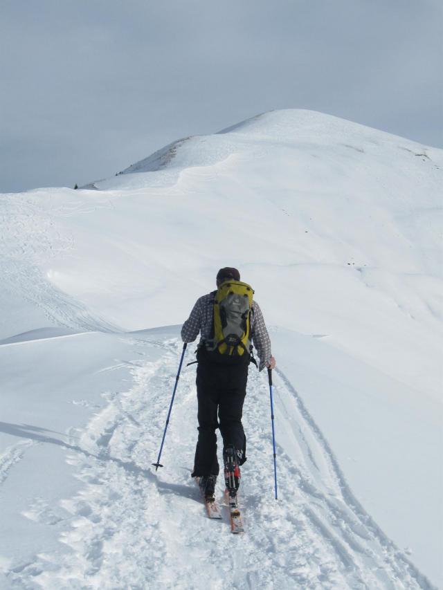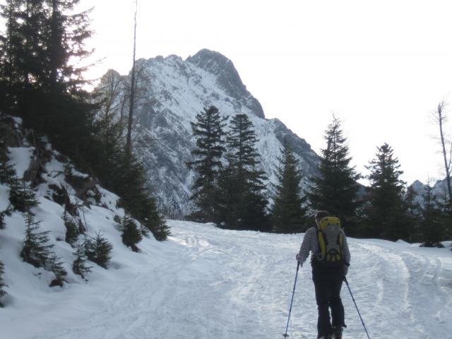 Tour wie in tourentipp beschrieben begangen. Man muss es ja schon mögen, rund 1,5 Stunden oder ca. 60% der Gehzeit auf einer Forststraße zu gehen, aber sie ist nach wie vor gut verschneit, weist genügend Gefälle auf, um nirgends schieben zu müssen und ist breit genug, um schwingen zu können. In dem Stockhang im Anschluss der Forststraße ist es mittlerweile schwierig, Stein- oder Wurzelkontakt zu vermeiden. Hier bräuchte es dringend Neuschnee. Der weitere Rücken hat (derzeit) den Nachteil, dass er pistenmäßig ausgefahren und entsprechend hart ist,was den Aufstieg hier unangenehm werden lässt, zumal teilweise recht steil. Das letzte Stück am Gratrücken ist dafür umso schöner. Wir fuhren im oberen Teil über die Hänge zur Schönalm ab und stiegen von dort wieder zur Aufstiegsspur auf. In den Hängen teilweise noch Pulver, meist aber leicht verharschter Schnee. Auf dem Rücken und der Straße oberflächlich weich, darunter hart.