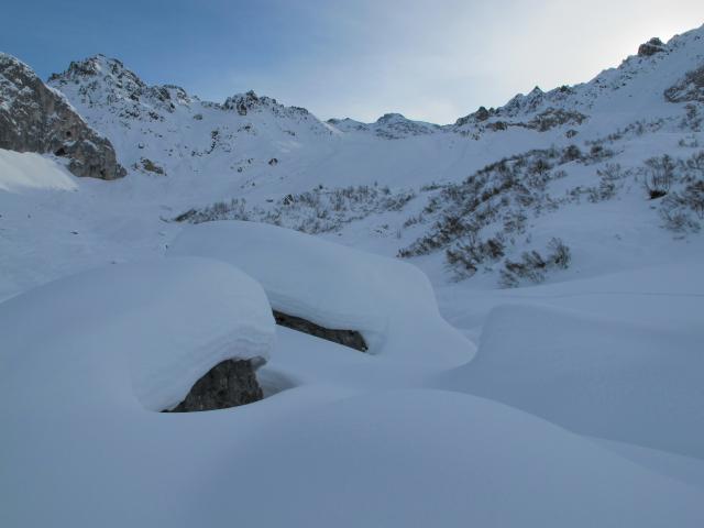 Abgesehen vom unmittelbaren Gipfelbereich, der sehr hart und teilweise abgeblasen war, nahezu durchgehend schöner Pulver. Schnon viele Spuren, aber wer ein bisschen sucht, findet noch herrliche unverspurte Abschnitte. Variante über Nordhang namens "Boller" war sehr lohnend.