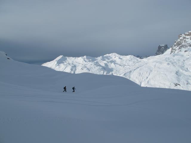 Tourenverhältnisse: Auch heute wieder ein Top-Skitourentag. Das Wetter hat gerade noch gehalten, zwischendrin hat es mal geschwächelt, morgen gibt es wohl etwas Neuschnee.