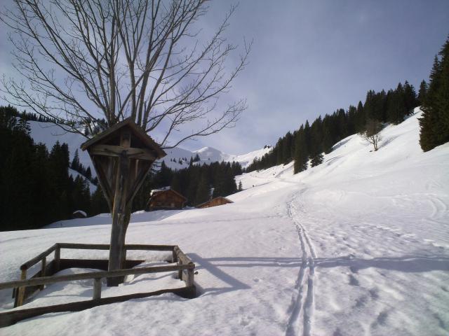 Sonstiges: Heute ging es auf der Suche nach dem frisch gefallenen Pulverschnee, der Sonne und Lawinensicherheit wieder mal in das Allgäu. Von Bolsterlang-Sonderdorf zur Straße in das Bolgental, an deren Beginn die Skier angeschnallt werden können (hierher auch von Obermaiselstein; der Weg von Bolsterlang durch den Bolgenach-Tobel statt der Straße empfiehlt sich im Winter normalerweise nicht). Bei unten für den Aufstieg gerade noch ausreichender Schnee- / Eisbedeckung (in der Abfahrt hätte man einige Male abschnallen müssen) durch das lange Bolgental zum Talschluss und heute direkt über den Osthang (etwas sicherer bei Querung zum Ostgrat und Aufstieg über diesen) zum Riedbergerhorn. Während es unten noch sehr warm war und sonnig, zog der Wind ab der Zunkleiten-Alpe doch deutlich an, am Mittag schon deutliche Sichteinschränkungen und starker Wind am Gipfel, sehr ungemütlich. Hochbetrieb von der Grasgehren her; insbesondere das Schneeschuhgeher-Unwesen wird hier sehr gepflegt (Skispuren zetreten, Hänge auf voller Breite umgepflügt).
