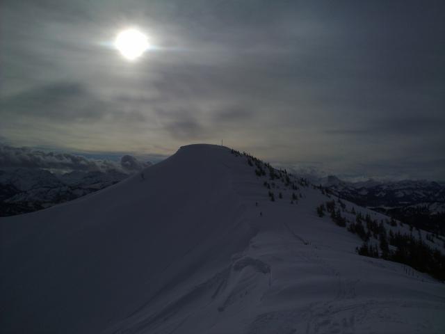 Bei der Abfahrt von einem nördlich vorgelagerten Gupf nach Osten Richtung Bolgen-Alpe gab es zwar keinen Pulver (war wohl von unten feucht geworden), der aufgeweichte Harschdeckel ließ sich aber meistens ganz gut fahren. Dann noch zum Großen Ochsenkopf und über Berghaus Schwaben zum Grat Richtung Weiherkopf. Abfahrt über die am Nachmittag vollständig buckligen Pisten bis ins Tal.