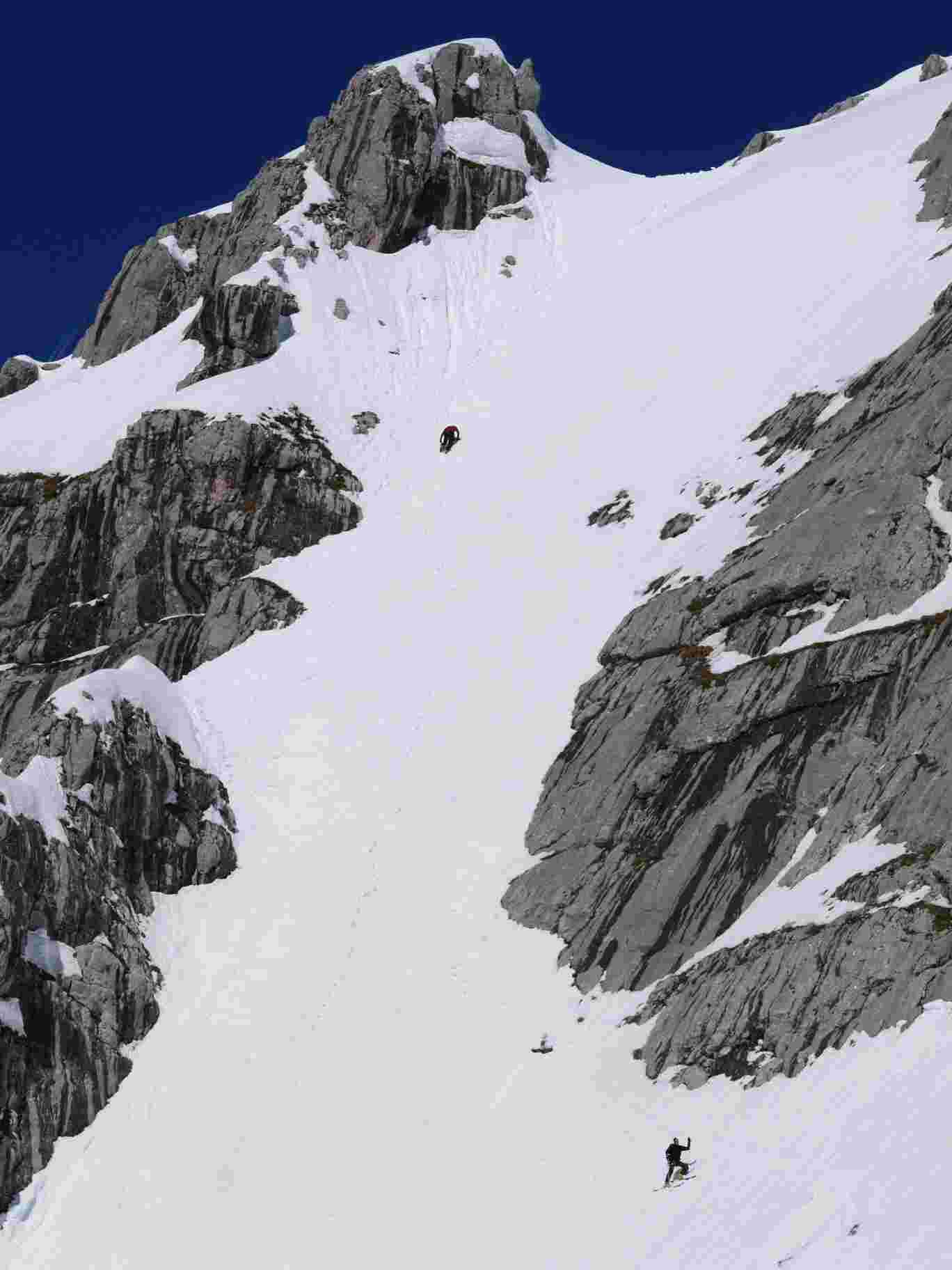 Tourenverhältnisse: Kein tragender Deckel von Anfang an. Bei Abfahrt um 12 Uhr schon sehr weich, firnÄHNLICHE (aber nicht wirklich) Verhältnisse nur im unteren Teil des Kars vor ca. 10:30 Uhr. Aufstieg in der Rinne um ca. 11 Uhr, tiefer weicher Trittfirn (aber noch OK), Abstieg und Abfahrt durch die Rinne um 11:45 Uhr fast zu spät, mind. 1h früher wäre besser. Kleine, aber heikle da schnelle Rutsche v.a. von einem Felsturm westlich der Rinne, daher Aufstieg am besten eher im etwas steileren Teil in der Mitte oder am östlichen Rand (siehe Bild).
