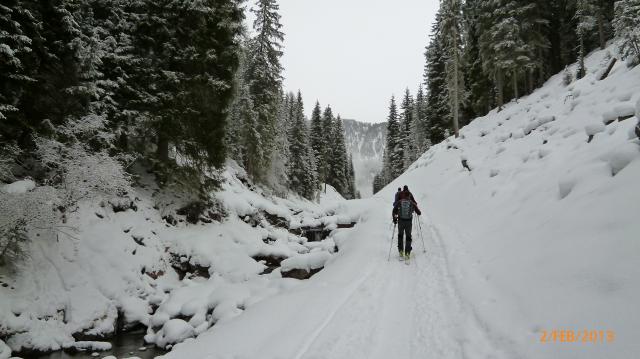 Heute gingen wir bei Neuschnee im Gedrumtal wieder i.R. Osten. Aufstieg zunächst im Waldgelände.