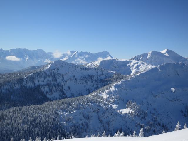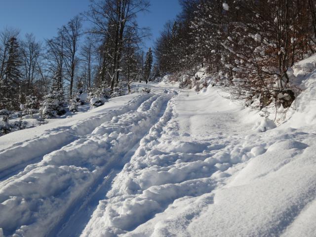 Tourenverhältnisse: Super! Es liegt genügend Schnee auch auf der Forststraße und im Hohlweg, die Latschen am Gipfelhang sind eingeschneit.