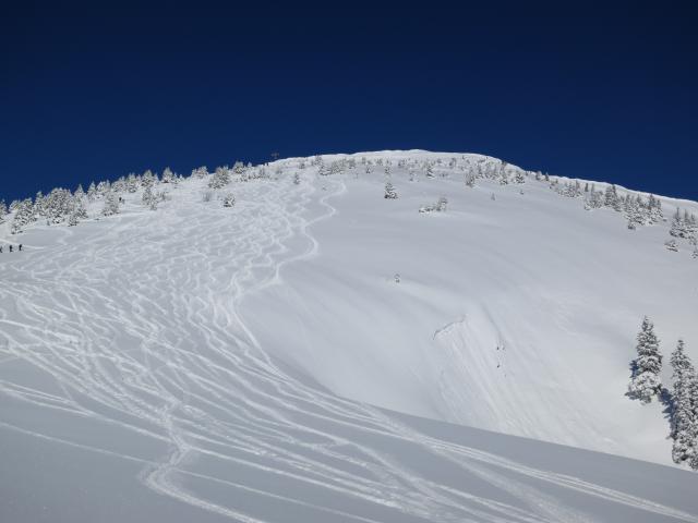 Prognose: wenn alle die runtergefahren sind, die bei meiner Abfahrt noch aufgestiegen sind, wird's wohl keinen unberührten Fleck mehr im Gipfelhang geben