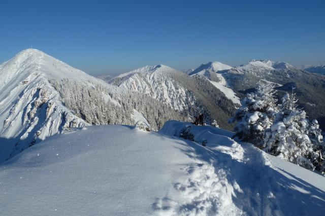 Runter erst Richtung Firstalmen, bald nach rechts durch die Scharte im fetten Powder zur Freudenreichalm (1202m) hinab und auf der Aufstiegsroute zurück.
