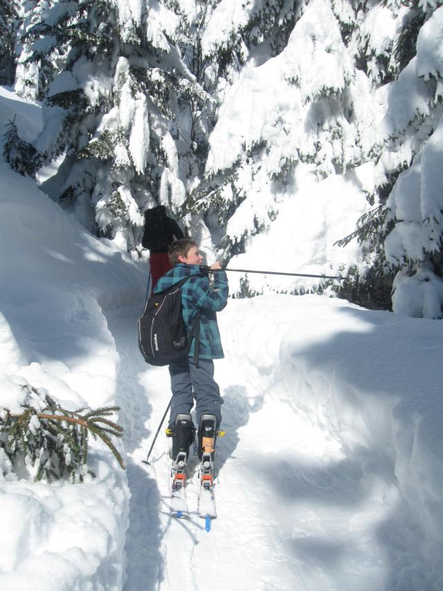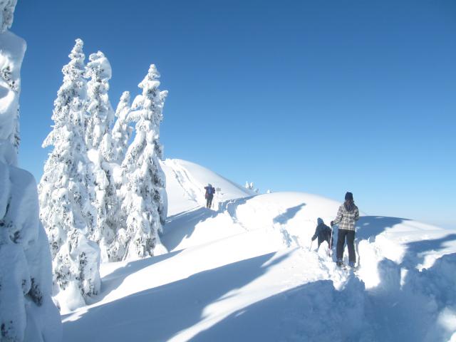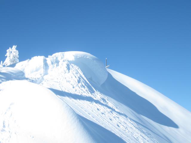 Sonstiges: Zusammen mit Heerscharen auf dem Normalweg zum Gipfel. Es lag so viel Pulverschnee (teilweise mehr als knietief), dass in den flachen Pasagen Aufsteiger und Abfahrer die gleichen Gräben benutzten, weil daneben sonst keiner weiter gekommen wäre! Für eine Abfahrt abseits der Hauptspuren lag schlicht zuviel Pulverschnee, der außerdem teilweise oberflächlich am Nachmittag bereits eine ganz leichte Harschkruste aufwies. Allerding war unter den Neuschneemengen offenbar keine bzw. kaum eine Unterlage, denn stellenweise haben die Abfahrer schon wieder Gras oder Wurzeln frei gelegt. Übrigens waren auf diesem Berg heute mindestens genauso viel Schneeschuhgeher wie Skifahrer unterwegs.