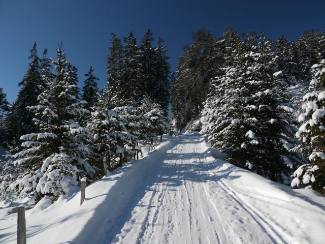 - der Abwechslung halber und um den Rodlern aus dem Weg zu gehen, Abstieg über den gut ausgetretenen "Alpsteig" (für Schneeschuhe ausser einem "selektiven" Brückerl problemlos und angenehm zu gehen; für Skifahrer im Aufstieg vmtl. nicht so toll, da steil und hakelig; ausserdem kommt in der unteren Hälfte schon wieder überall die Botanik durch)