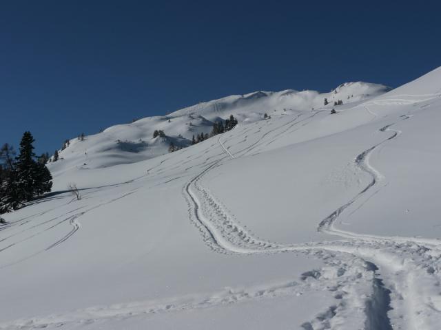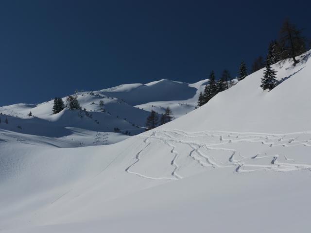 im hügeligen Gelände zwischen Simmeringalm und Gipfel gibt es diverse Aufstiegsvarianten, auf denen einem eigentlich nichts passieren dürfte. Warum aber jemand bei LWS3 seine Aufstiegsspur in Spitzkehren durch den nahezu einzigen gefahrenträchtigen Steilhang legt und dabei offenbar 3 Mini-Lawinderln auslöst, bleibt mir ein Rätsel. Wären die "Lawinchen" nur ein wenig mächtiger gewesen, hätte man sich ob der darin verschwindenden Skispur durchaus Sorgen machen müssen. Unnötiger als hier kann man sich eigentlich kaum in Gefahr bringen! Aber ich muß ja nicht alles verstehen....