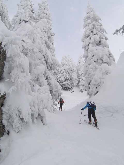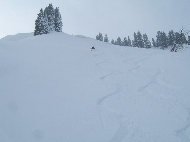 Tourenverhältnisse: bei leichtem Nebel und Schneefall auf dem geräumten und hart gefrorenen Forstweg zur Schwarzentenn-Alm; ab der Raualm ziemlich zugig; aufm Schönberg viele Tourengeher die meisten kamen von Fleck rauf, demzufolge dürfte diese Abfahrt schon ziemlich eingefahren sein. Ab Mittag blinzelte immer mal wieder die Sonne durch. Unsre Abfahrten alle mit genialem Powder (südseitige Hänge allerdings schon mit Deckel); massig Schnee