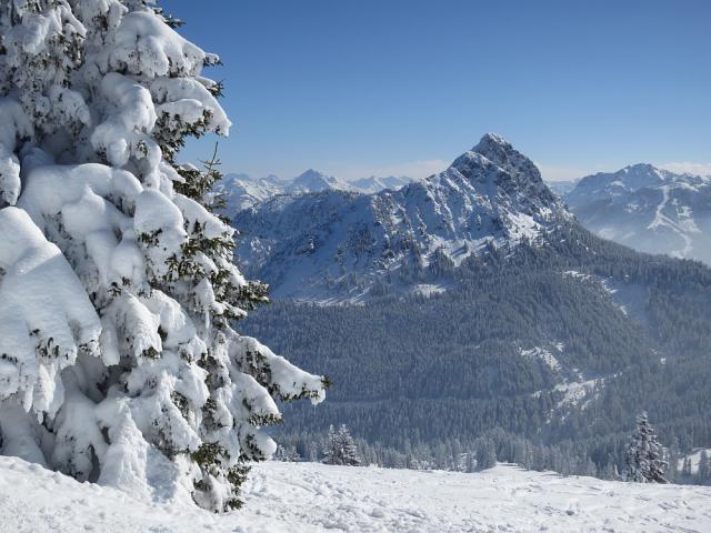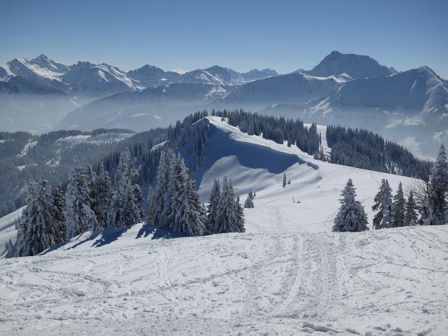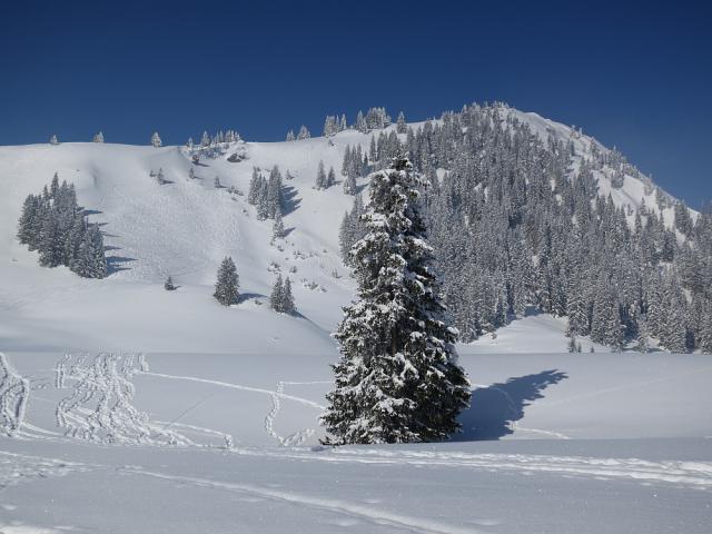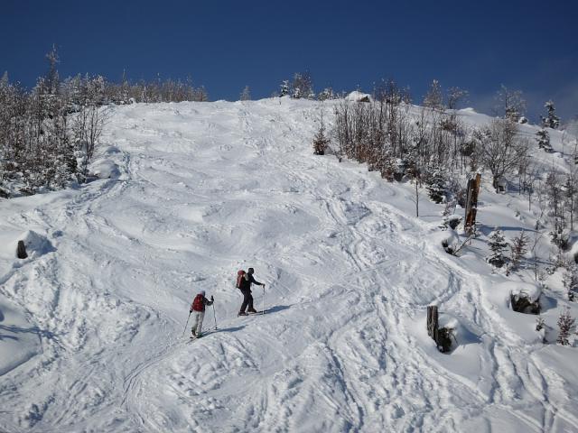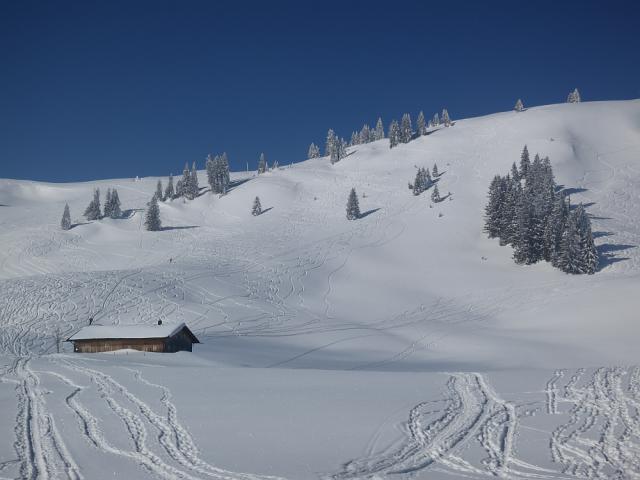 Tourenverhältnisse: sehr gut bei Kaiserwetter! Hänge über der Pfrontener Alm mit Pulver vom Feinsten und noch Platz für eigene Schwünge. Die Waldschneise war an den Engstellen allerdings pistenmäßig bucklig eingefahren. Der Hohlweg hatte noch genügend lockeren Schnee.