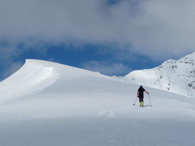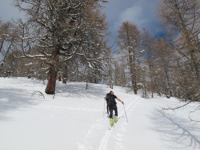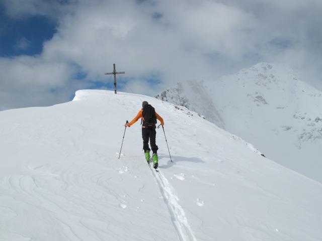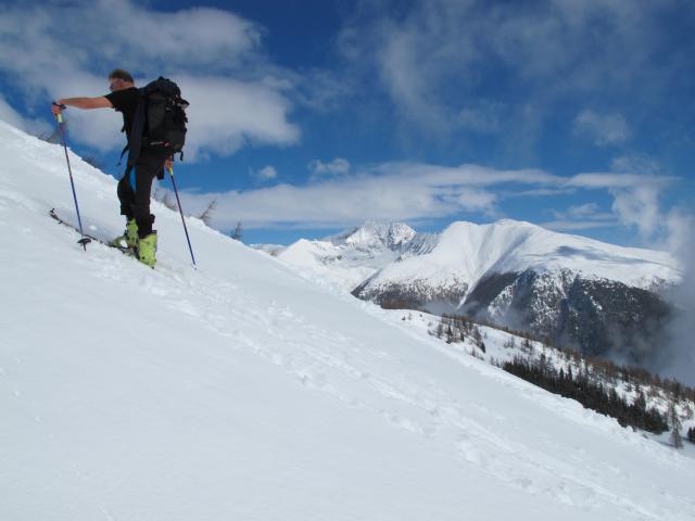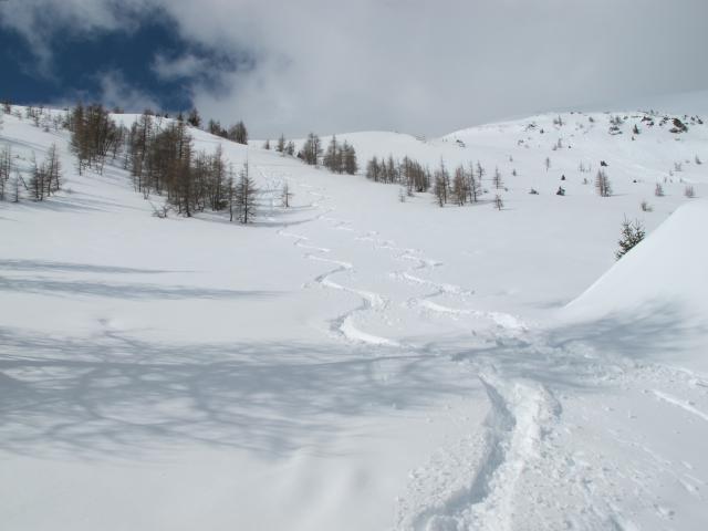 Tourenverhältnisse: Heute gutes Wetter. Nur eine Spur vor uns, zum Gipfel dann selbst gespurt. Abfahrt in Firn (oben), dann in schon etwas schwerem Pulver (mittlerer Teil -noch gut zum Fahren) und unten schon schwerem Schnee (ging aber auch noch). Toller Aussichtberg!