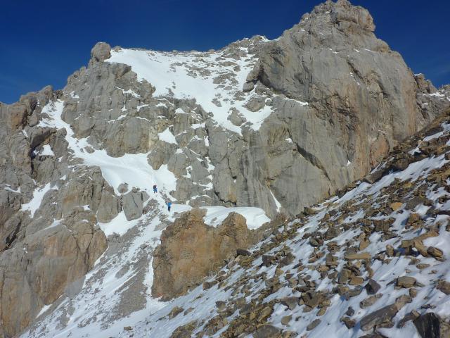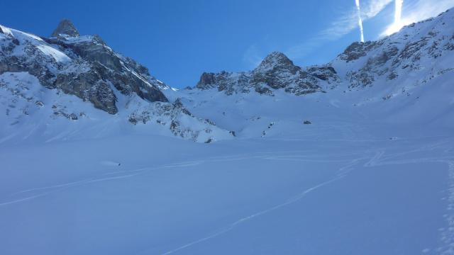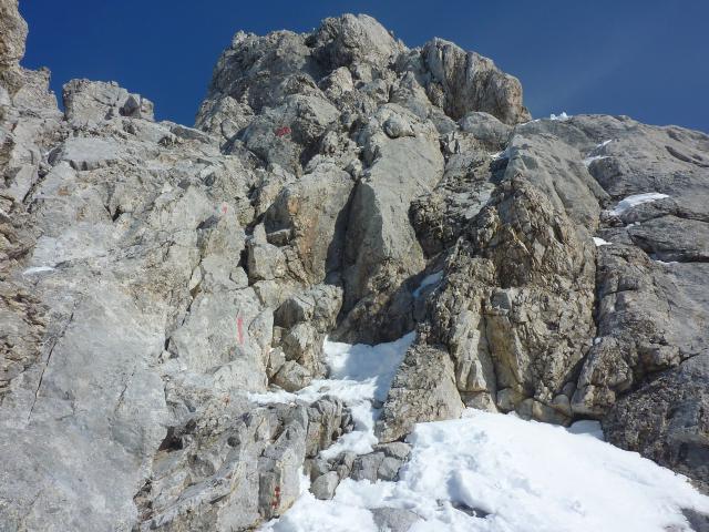 Tourenverhältnisse: sehr gute Verhältnisse, wie im anderen Bericht auch: Steigeisen für die Tunnel im Sulzltal sehr hilfreich. Der 800-m-Hang nach der Simmshütte ein Traum und tolle Spuranlage. Keine Harscheisen nötig. Im Gipfelaufbau bei harten Verhältnissen in der Früh, Steigeisen und Pickel sinnvoll. Die Felsen sind schneefrei und fast schon sommerliche Verhältnisse. Ab Skidepot unterhalb Fallenbacher Joch zu Fuß.