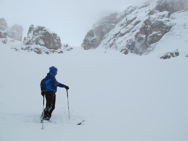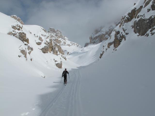 Tourenverhältnisse: Perfekt. Heute Nacht gab es in den Hochlagen ca. 10 bis 20 cm Neuschnee (ohne Wind), unten ist die Neuschneemenge nicht erwähnenswert. Während des Aufstiegs hat es für 2 Stunden aufgemacht, so dass man die herrliche Umgebung genießen konnte. Aufstieg in die Valbonscharte steil (ca. 35 Grad) und noch nicht gespurt. Abfahrt durch das große Valbontal bei traumhaftem Pulver - und noch völlig ohne Spur!!! Leider wurde die Sicht zunehmend schlechter, aber bei perfektem Schnee war nicht einmal das ein Problem. Sehr schöne Durchquerung