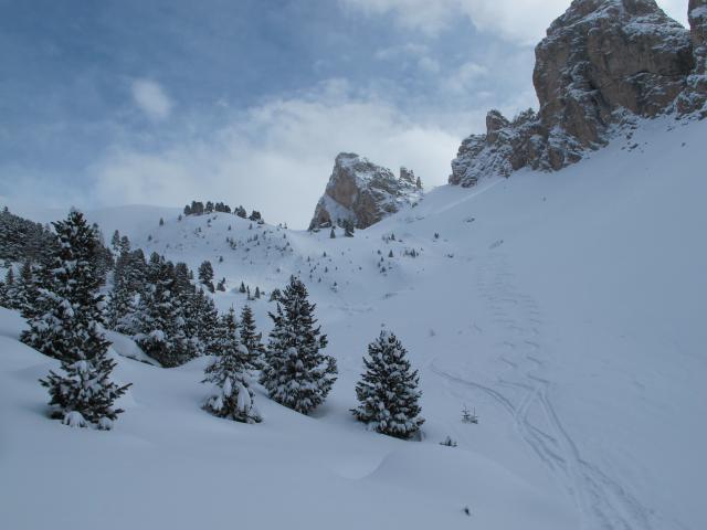 Tourenverhältnisse: Traumhafter Schnee beim Aufstieg in die Scharte, ca. 20 cm feinster Pulver ohne Wind auf harter Unterlage. Auf der anderen Seite sah es dann allerdings anders aus: hier waren deutlich Windzeichen zu erkennen und der Schnee war bei der Einfahrt ins Chedultal auch leicht gepackt. Der Gipfelanstieg zum Col Toron war noch nicht gespurt und hatte deutliche Windzeichen über den gesamten Hang verteilt. Da ich ganz alleine unterwegs war, entschloss ich mich, mir die Sache nicht näher anzusehen, kein Risiko einzugehen und bin ebenso wie 2 Italiener gleich durchs Chedultal abgefahen. Hier sehr schöner Pulver. Unten geht es ein Stück recht hakelig durch den steilen Wald. Bei Hartschnee würde ich diesen Teil zu Fuß machen, sonst eine reine Genusstour!
