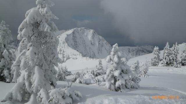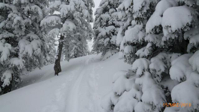 Abfahrt in der Querung Blindflug. Dann ab den Bäumen wesentlich besser, tw. kniehoher Pulver, absolut