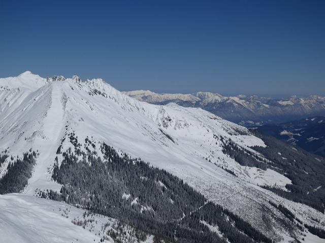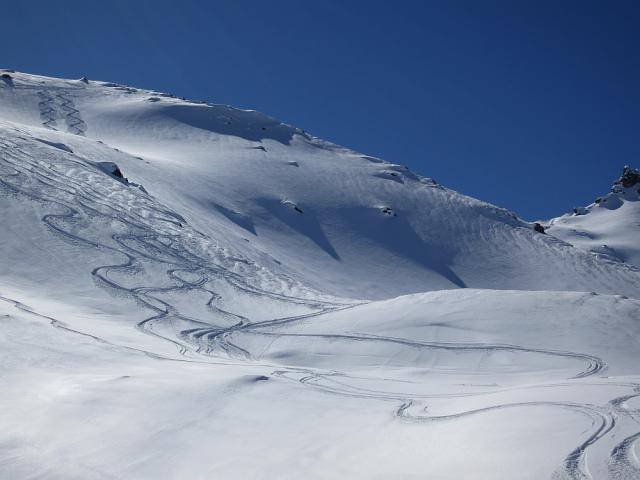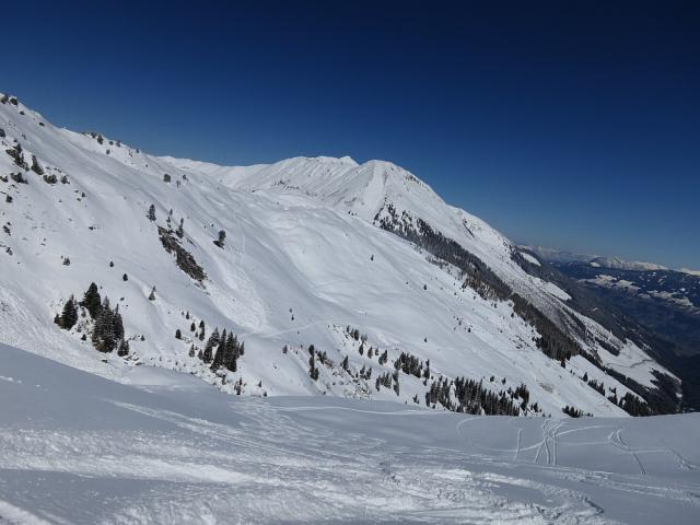 Tourenverhältnisse: ein Traumtag mit Traumpulver (Abfahrt mittags). Aufstieg in guter Spur. Abfahrt Richtung Maschentalbach, deutlich vor Erreichen des Baches rechts über weitere Hänge, zuletzt ein kurzer Waldabschnitt, weiter bis zur Loipe. Schöner Pulverschnee (so um 30 bis 40 cm) auf fester Unterlage.