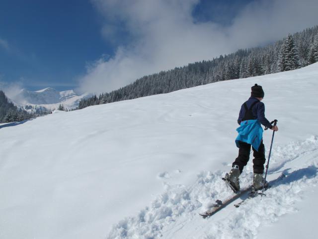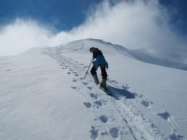 Tourenverhältnisse: Beste Tourenverhältnisse - ca. 15 cm Pulver auf harter Unterlage. Ich bin vom Gipfelgrat nach Süden eingefahren, hier konnte man am späten Mittag die wenigen Zentimeter warmgewordene Neuschneeauflage leicht auf der harschigen Altschneedecke wegschieben - ansonsten sehr sichere Verhältnisse. Neben der Hauptabfahrtsroute noch viel Platz für eigene Spuren. Oben schön pulvrig, nach unten hin schon etws schwerer Pulver, aber immer gut zu fahren.