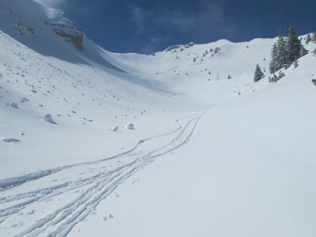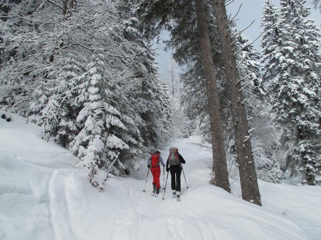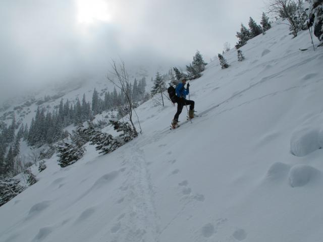 Tourenverhältnisse: Ca. 10 bis 15 cm frischer, ohne Wind gefallener Pulverschnee auf harschiger Unterlage. Nebelgrenze anfangs auf ca. 1600 m darüber strahlender Sonnenschein. Der lockere, später auch feuchte Pulver war kaum mit der harschigen Altschneedecke verbunden, so dass man im Steilgeländer fast aller Expositionen oberflächliche Schneerutsche produzieren konnte. Nur in ganz schattigen Lagen war es besser. Zum Skifahren heute der Hit, allerdings musste man im Steilgelände schon ein wenig aufpassen. Ich bin über die Scheinbergroute zum Lösertalgraben, was 150 Hm Zusatzabfahrt bedeutet, aber auch einen Gegenanstieg. Auf dieser Route war die Forststraße gut mit Schnee bedeckt, nur an wenigen Stellen harschig oder eisig (dürfte morgen allerdings anders sein). Der Hasentalgraben war nach Auskunft eines anderen Tourengehers ohne Harscheisen nicht sehr angenehm zu gehen.