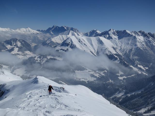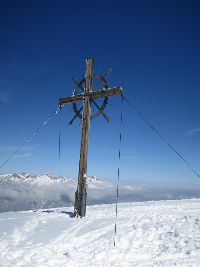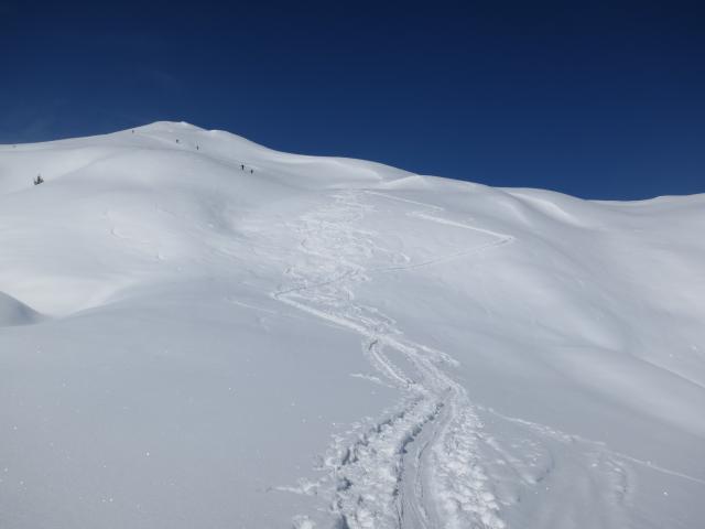 Tourenverhältnisse: gut! Abfahrt vom Gipfel weg im Pulverschnee auf fester Unterlage. Ab Waldgrenze teils pulvrig, teils leicht angefeuchtet. Im Wald liegt noch ausreichend Schnee, auch wenn schon erste apere Stellen erscheinen. Der letzte Wiesenhang vor dem Ziehweg zum Rotlech und der Ziehweg selbst hatten ebenfalls genügend Schnee. Kein Steinkontakt und keine Grasberührung. Wetter:vom Parkplatz weg fast wolkenloser Himmel und leicht windig am Gipfel.