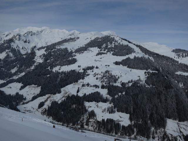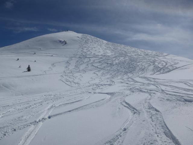 Tourenverhältnisse: Aufstieg problemlos (Piste griffig, Vorgipfel nicht verblasen). Abfahrt an dem flachen Stück vom Gipfel weg bereits harschig. Aber ab dort, wo der Hang steiler wird, gab's Pulver (zwar schon etwas verspurt, Bild 3) bis zur Kleinmoosalm (alles schattseitig). Von der Alm weg unterschiedlich: leicht feuchter Pulver im Schatten, schwerer Schnee in der Sonne. Auf der Piste war's dann griffig (Schatten) oder firnig/leicht sulzig (Sonne).