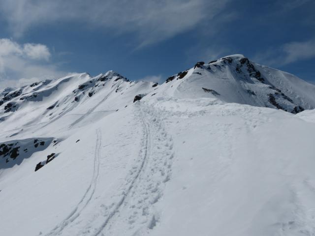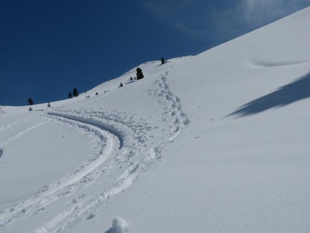 Ohne Spur den unteren Abschnitt des Gratrückens hinauf, wo auf halber Höhe dann die Skispur einmündete. Nun jeweils auf dem Grat oder leicht links davon unschwierig zum Gipfel. Abstieg dann "planmässig" und angenehm über das Gelände der Schneegrubenalm...