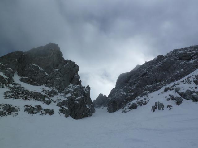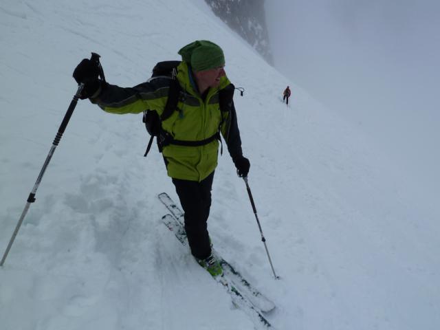 Gefahreneinschätzung: Hauptproblem war die äußerst schwierige Orientierung mangels Sicht, was in der Abfahrt uns nach einem Verhauer auf ca. 1600 m Höhe (wir sind abseits der Hauptroute in bei dieser Sicht schwer kalkulierbares Steilgelände geraten) einen unfreiwilligen zweiten Aufstieg (= Flucht nach oben) beschert hat. Irgendwann fanden wir die fette Aufstiegsspur wieder und sind entlang dieser abgefahren. Teilweise in Steilgelände frische kleinen Lawinenrutsche.