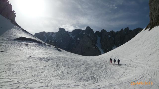 Gegen 10.30 Uhr Abfahrt ins Firn und Harsch, sehr gut zu fahren. Nur die etwas flacheren Hänge tw. weich.