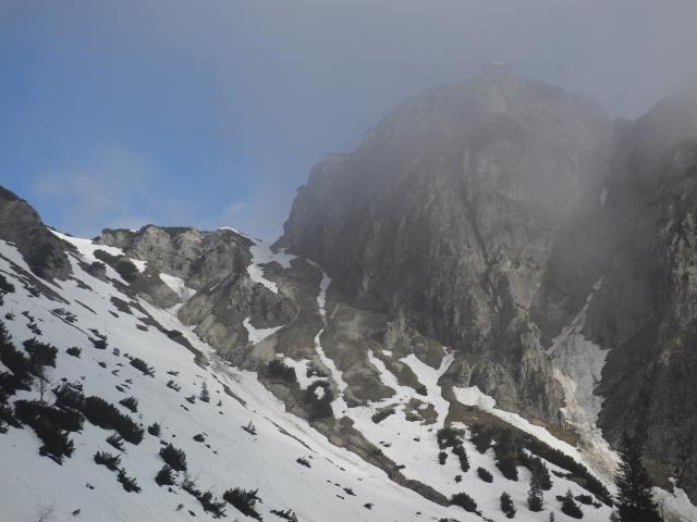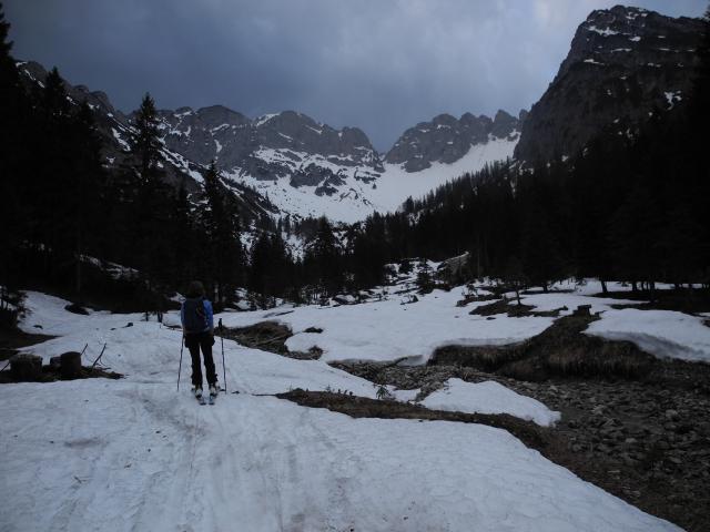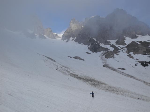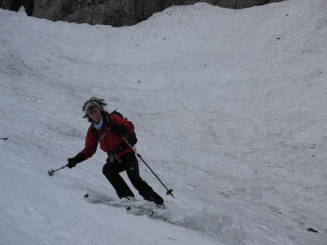 Tourenverhältnisse: 20 Minuten Ski tragen, wird jeden Tag mehr. Abfahrt im Kar Super, obwohls nicht durchgefroren hat in der Nacht