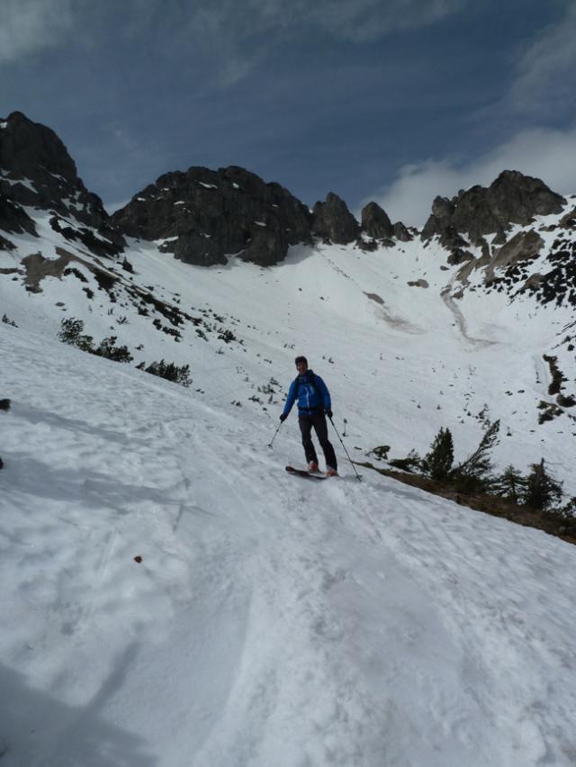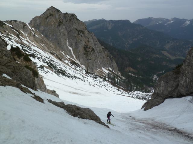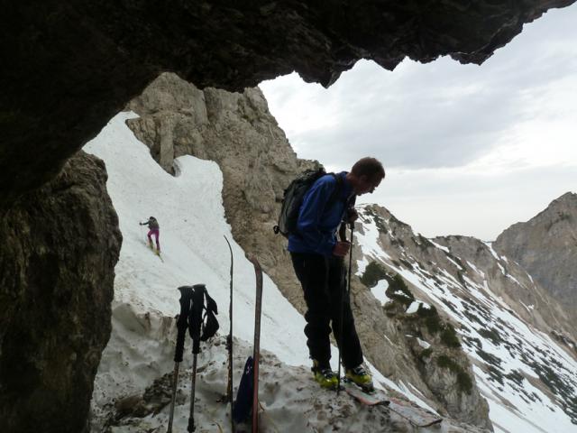 Tourenverhältnisse: Im Kar sehr kompakter und wunderbar zu fahrender Sommerfirn. Weiter unten ab den Latschen) wird's sulziger, aber auch dort gut zu fahren. Tragestrecke inzwischen ca. 25 Min., danach noch 3-4 kurze apere Stellen. Das Schindertor ist so weit offen, dass man hindurchklettern kann (ist derzeit die bessere Variante). Harscheisen bei 10 Grad plus nicht nötig.